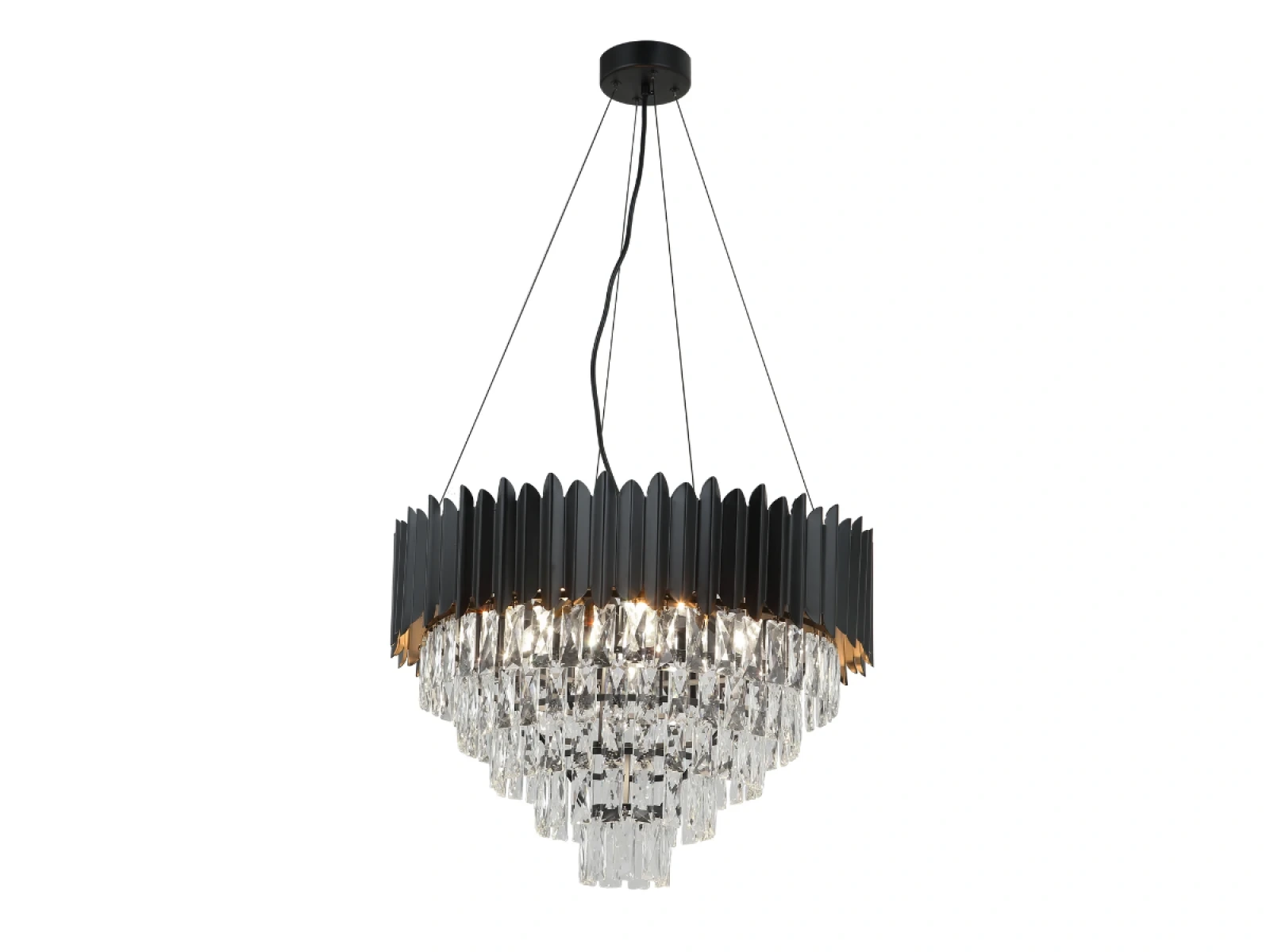 Toto výnimočné svietidlo spája moderný štýl s precíznym remeselným spracovaním. Telo svietidla je vyrobené z kvalitného kovu v elegantnom odtieni čiernej farby, pričom jeho povrch je bohato zdobený jemne brúsenými kryštálmi, ktoré nádherne lámu svetlo a vytvárajú jedinečný svetelný efekt.