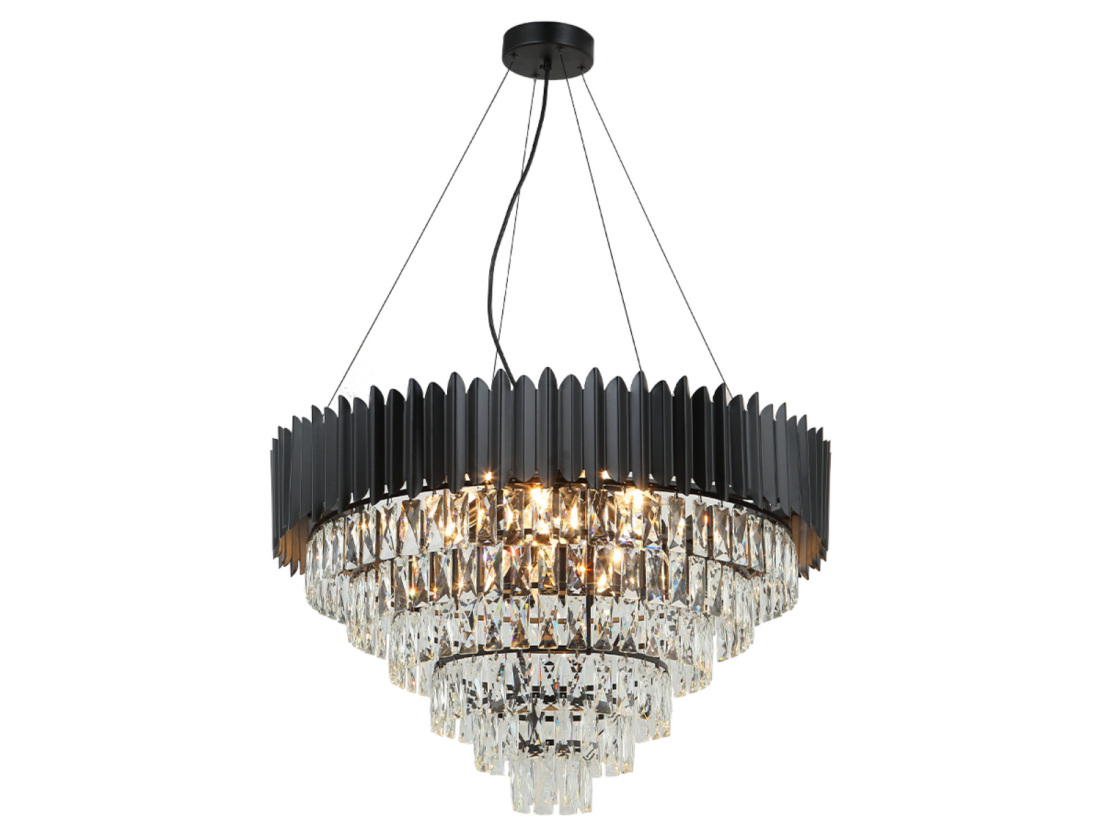 Toto výnimočné svietidlo spája moderný štýl s precíznym remeselným spracovaním. Telo svietidla je vyrobené z kvalitného kovu v elegantnom odtieni čiernej farby, pričom jeho povrch je bohato zdobený jemne brúsenými kryštálmi, ktoré nádherne lámu svetlo a vytvárajú jedinečný svetelný efekt.